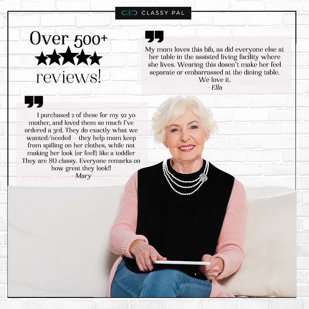 The Gift of Happiness and Dignity - Celebrate yourself or a loved one and feel and look your best while dining at home or in a restaurant. Classy Pal Clothing Protectors are perfect to help keep clothes clean during mealtime (dining), applying makeup or a commute to work. The Classy Pal adult bib can easily be washed and reused many times over and over again. Compliments are sure to come!