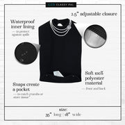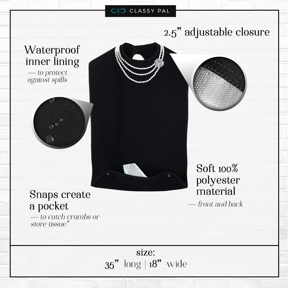 Your Clothing is Protected - The Classy Pal adult clothing protector “bibs” were designed with full lap and chest protection at a large 18” wide x 35” long . All protectors have bottom snaps that allow for optional crumb catcher and/or pocket when needed. The bibs are composed of the finest soft terry cloth material with a waterproof inner lining to help under clothes stay clean when spills happen. The clothing protectors feature a 2.5” hook and loop closure for strong hold and easy length adjustment.