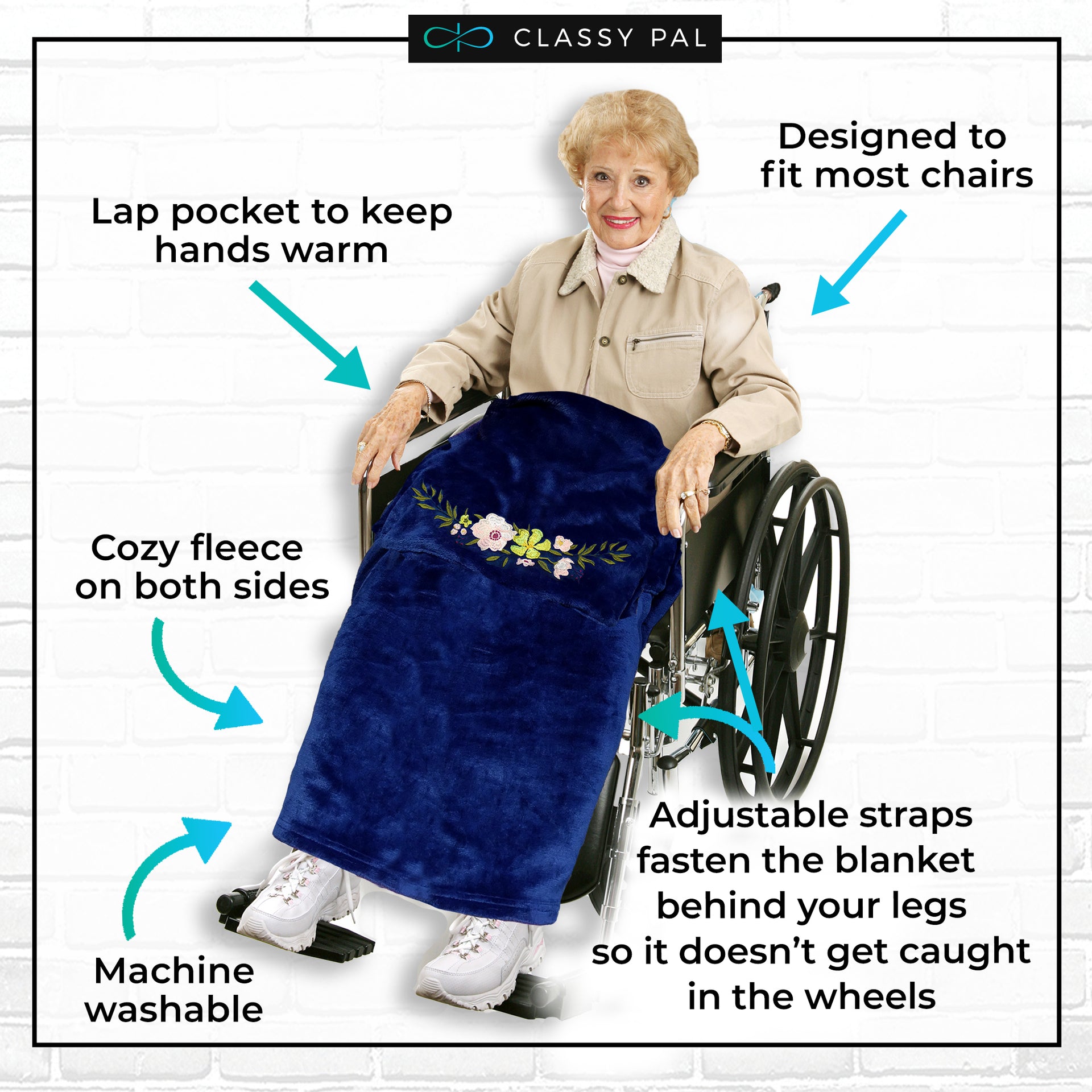 Stay Cozy & Warm - The Classy Pal Wheelchair Blanket was designed with a large lap pocket to keep hands warm. The plush blanket measures 39” wide by 42” long with four straps to securely attach the blanket to any chair, and two hook and loop patches that fasten behind the legs, so you don’t have to worry about the blanket falling off or getting caught in the wheels. The blanket-poncho is perfect for men or women, young or elderly, to use and is compact and portable enough to store in your small carry-on bag or packable case.