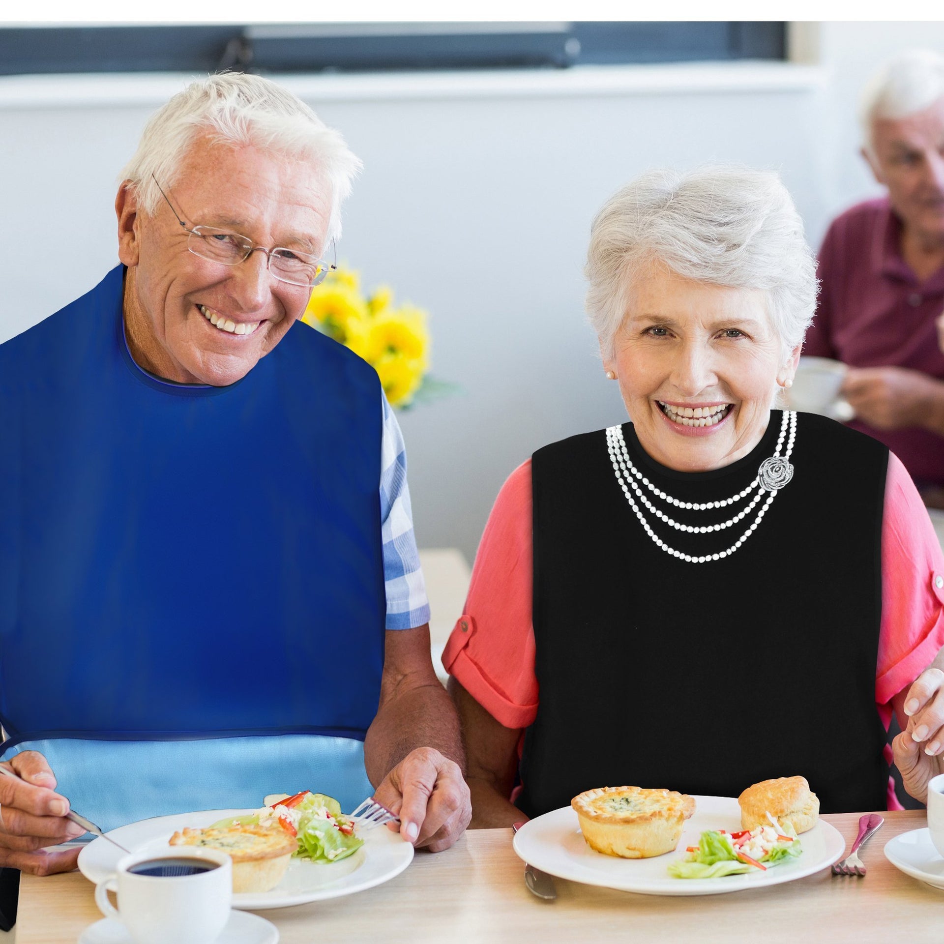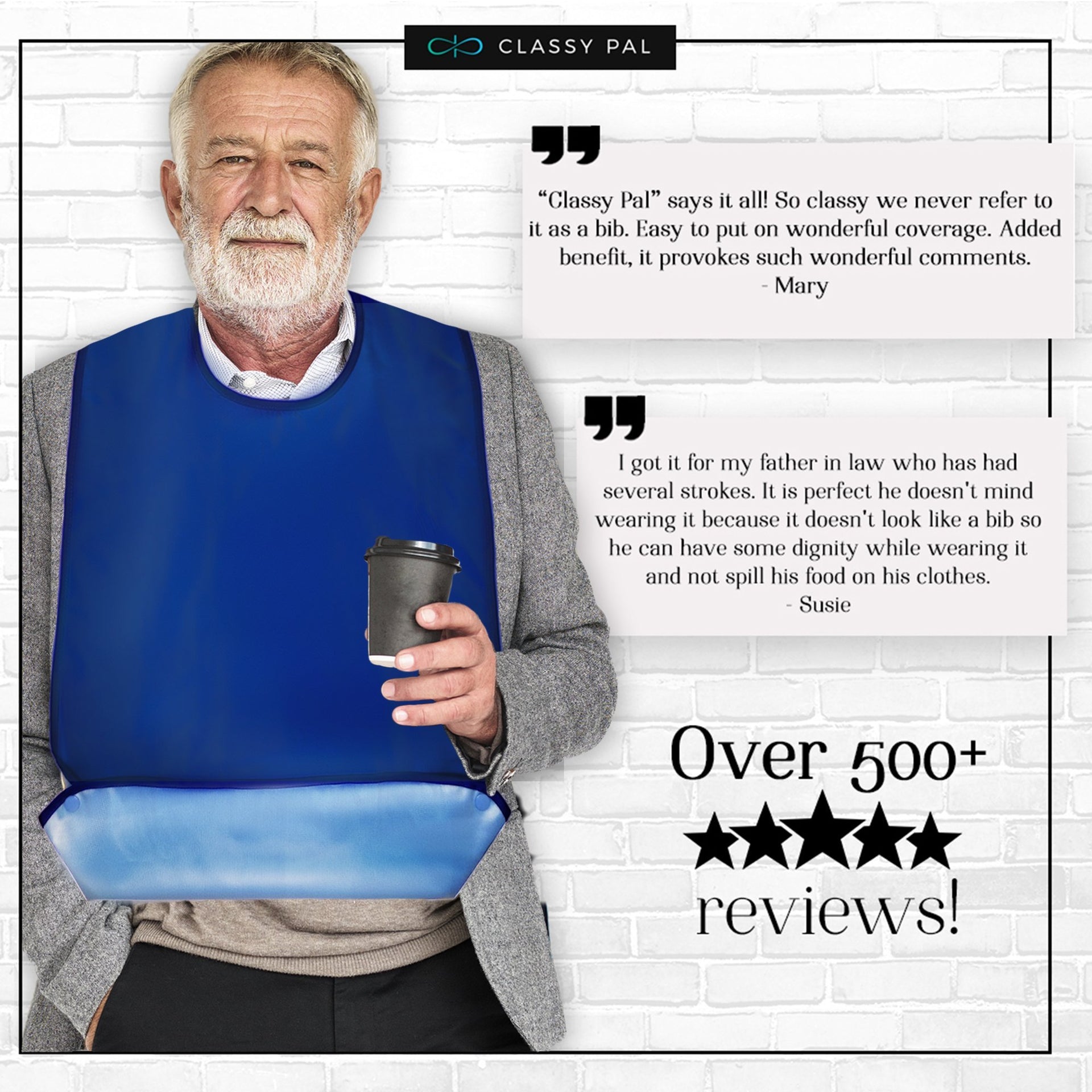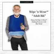 Not Your Average Adult Bib - Classy Pal Wipe ‘n Wear Clothing Protectors are much more than the typical adult bib on the market. The adult bibs for eating are composed of the finest woven plastic and vinyl material with a waterproof inner lining to help under clothes stay clean when spills happen. For many adult senior citizens wearing a bib is demoralizing, but now your loved one can feel dignified, confident, and beautiful.